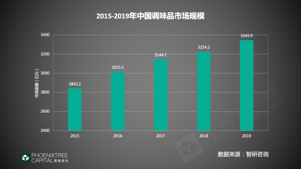 調(diào)味品自20世紀90年代后期開始市場化,2016、2017年資本熱度攀升,今年其與線上食品品牌、小家電一同躋身大消費領(lǐng)域3大熱門賽道。據(jù)智研咨詢數(shù)據(jù),2019年中國調(diào)味品市場規(guī)模已達3345億元,8年間復(fù)合增長率為7.5%,前瞻產(chǎn)業(yè)研究院預(yù)測2020年有望突破4000億。