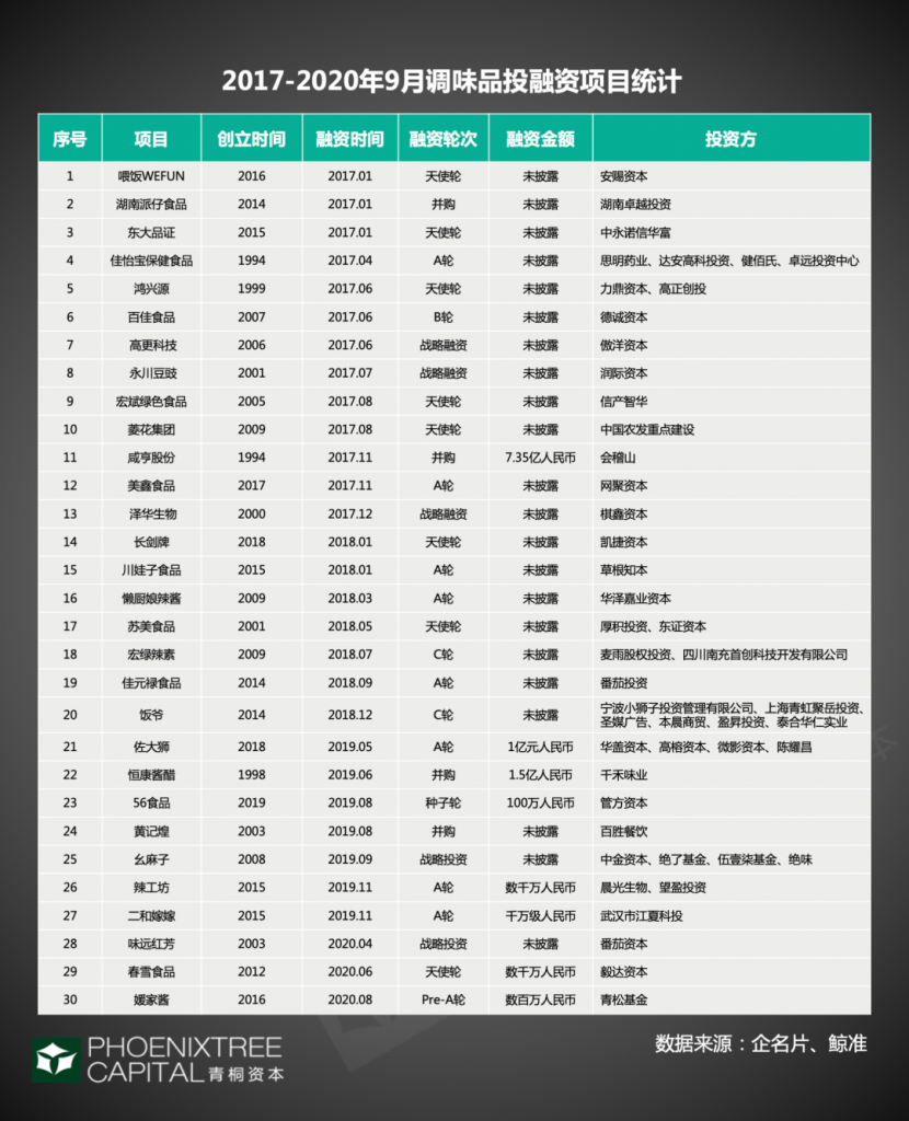 有個特別的現(xiàn)象,調(diào)味品玩家數(shù)量龐大,資本關(guān)注度亦高,但最終投資的項目量并不多。這主要因為符合機構(gòu)投資邏輯的標的有限,資本看調(diào)味品項目,重點會考量渠道、供應(yīng)鏈能力。