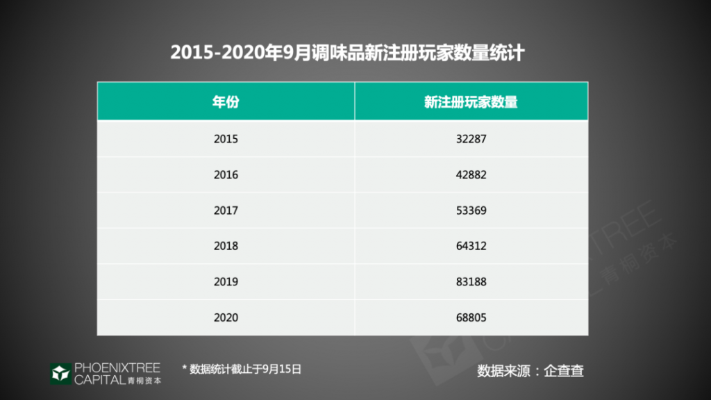 同時,賽道新玩家數(shù)量逐年上漲,據(jù)企查查數(shù)據(jù),2020年1-9月,調(diào)味品新注冊企業(yè)共68805家,2019年為83188家,已是2015年的2.5倍。