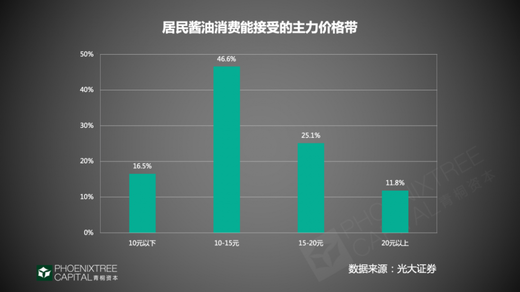其次,產(chǎn)品價格不斷升級,根據(jù)Euromonitor數(shù)據(jù),2019年我國調(diào)味品行業(yè)平均零售價為19.4元/千克,2014-2019年逐年上漲,復(fù)合增長率為3.5%。另據(jù)光大證券,國內(nèi)居民購買醬油的主力價格帶,也從10元以下,上升到10-15元,占46.6%。