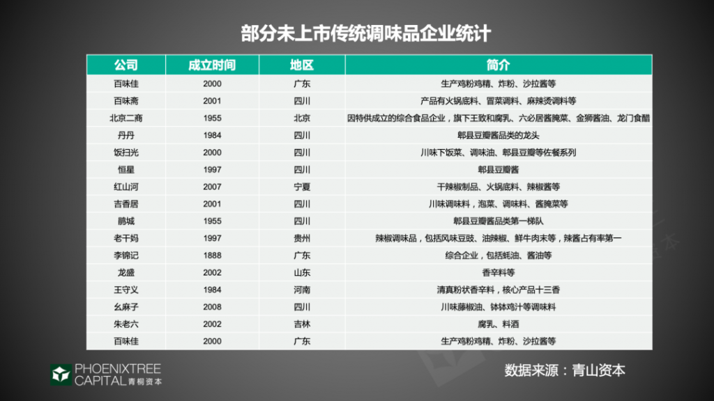 其中,未上市傳統(tǒng)調(diào)味品企業(yè)也是賽道重要玩家,主要呈現(xiàn)2大特點:1)普遍體量大,已成為細分品類的頭部。來自公司官方數(shù)據(jù),辣椒醬龍頭老干媽,2019年銷售收入破50億元,同比上漲14.43%;香辛料龍頭王守義,2019年營收超30億元。2)品類上,川貴地區(qū)的辣椒調(diào)味品居多,如老干媽、百味齋、丹丹、飯掃光、恒星等。由于良好的現(xiàn)金流,經(jīng)營理念偏傳統(tǒng),這類企業(yè)融資需求往往并不強烈。