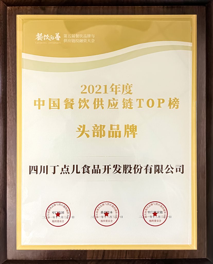 ? ? ? ? 在此次評選活動中,丁點兒股份獲得各界評委的一致認可,從參評的3000+個同類供應(yīng)商品牌中脫穎而出,獲得“2021年度中國餐飲供應(yīng)鏈TOP榜頭部品牌”稱號。此項榮譽是對丁點兒股份在中國餐飲行業(yè)做出卓越貢獻的高度肯定,也是對企業(yè)發(fā)展前景有著更高的期望。