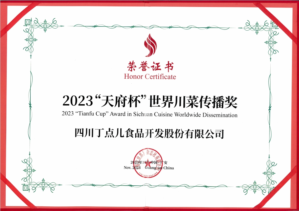 憑借出色的企業(yè)影響力和巨大的發(fā)展?jié)摿?,丁點兒食品在這一年又斬獲了多項榮譽?!澳甓瘸壠放浦恰?、2023“天府杯”世界川菜傳播獎、第十一屆中國食材電商節(jié)-優(yōu)質(zhì)企業(yè)推薦等稱號,充分展示了行業(yè)對丁點兒食品實力的肯定。