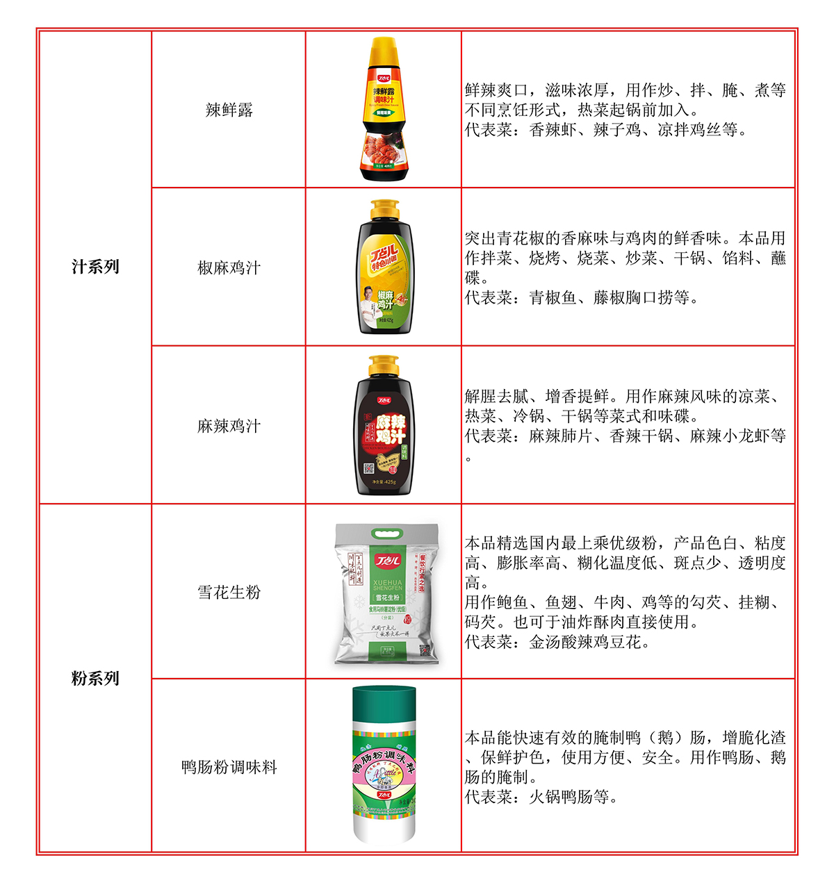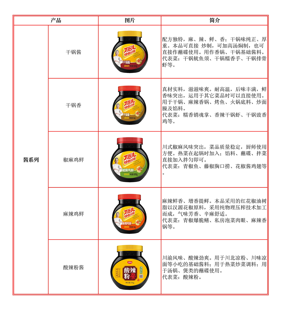 公司主要面向餐飲企業(yè)提供標(biāo)準(zhǔn)化、便捷化的川味特色調(diào)味料,主要有川味復(fù)合調(diào)味料、川味特色花椒油兩大類產(chǎn)品。川味復(fù)合調(diào)味料按形態(tài)劃分主要有醬、汁、粉、油四種形態(tài);按口味劃分,圍繞川菜“麻”“辣”“香”的特點(diǎn),主要有椒麻、麻辣、酸辣、鮮香等多種口味,共計(jì)200余種產(chǎn)品。川味特色花椒油主要有漢源紅花椒油、藤椒油等產(chǎn)品。主要產(chǎn)品如下:
